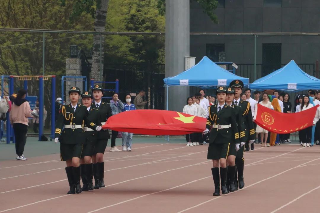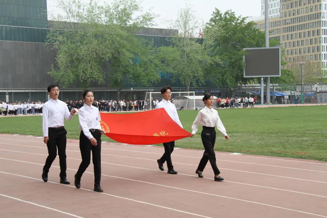 首先,⼤会第⼀项——国旗⽅阵、院旗方阵⼊场,升中华人民共和国国旗、全体师生奏唱中华人民共和国国歌。
